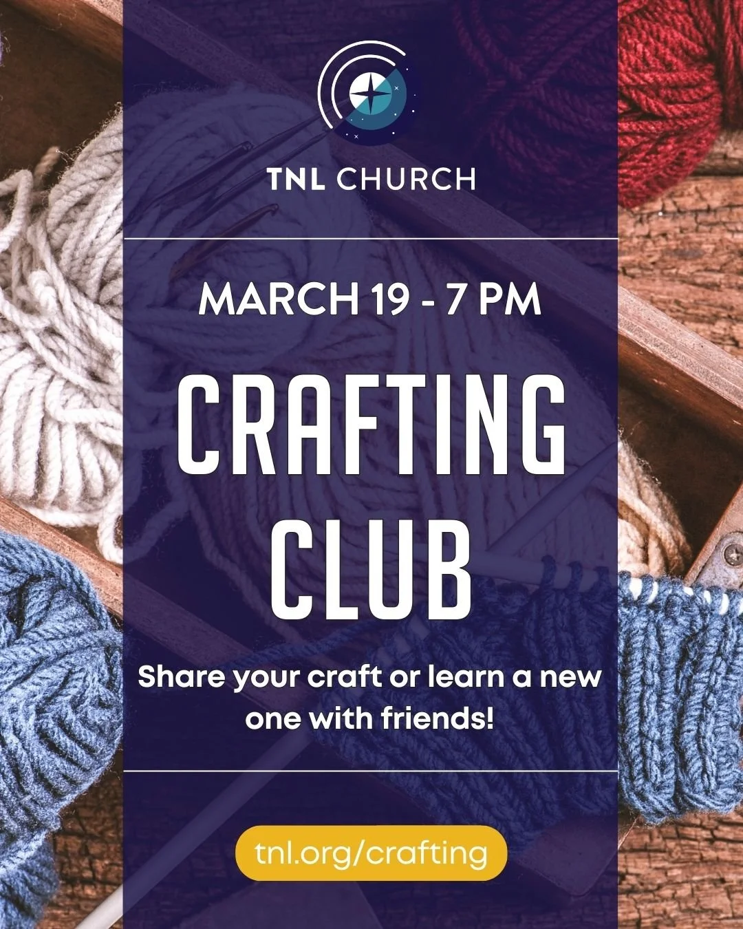 Crafting Club - 03/19 Mar 6 Written By TNL Our first Crafting Club will be Thursday, March 19th @ 7pm.Whether you crochet, paint, or βartβ in any way, join us to share your craft or learn a new one!All are welcome! TNL