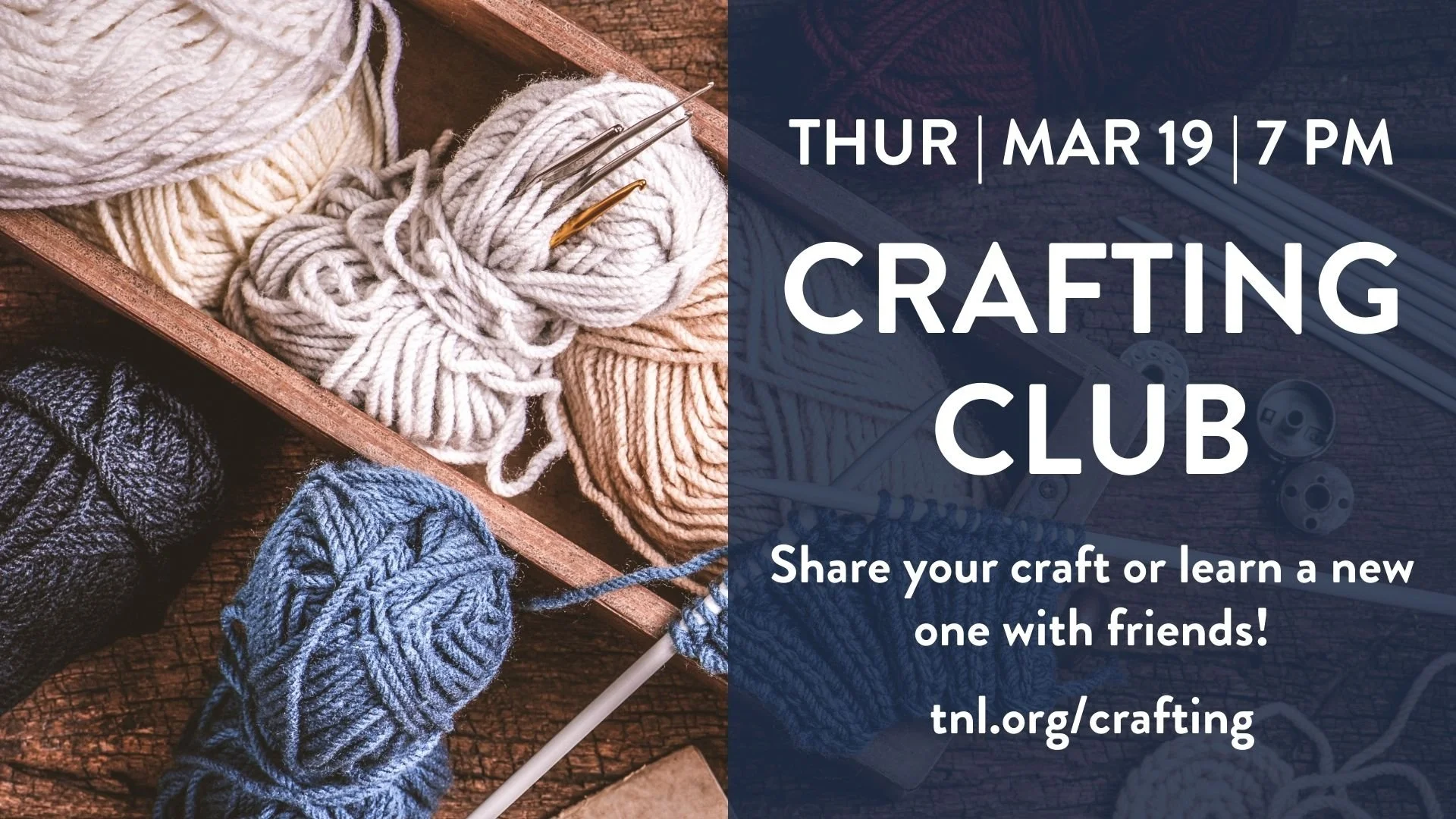 Crafting Club - 3/19 Mar 6 Written By TNL Our first Crafting Club will be Thursday, March 19th @ 7pm.Whether you crochet, paint, or βartβ in any way, join us to share your craft or learn a new one!All are welcome! TNL