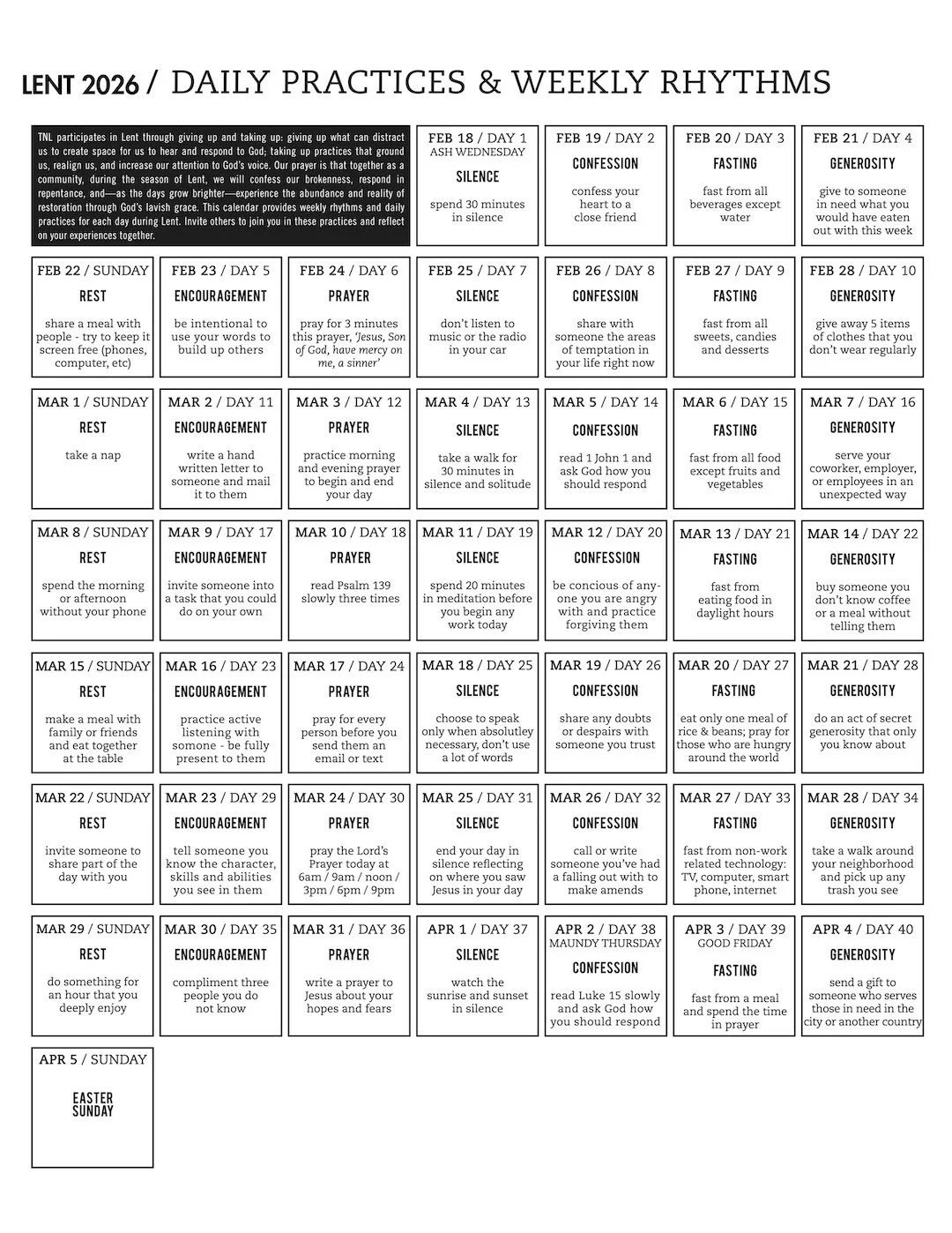 TNL participates in Lent through giving up and taking up: giving up what can distract us to create space for us to hear and respond to God; taking up practices that ground us, realign us, and increase our attention to God’s voice.